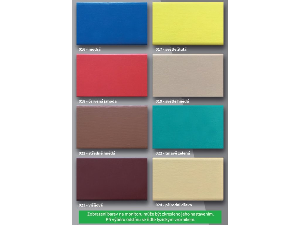 Zvolte variantu zelená 06 žlutá 05 modrá 016 červená 018 bílá 01 černá 013 tmavě hnědá 09 červenohnědá 07 slonová kost 014 palisandr 010 světle žlutá 017 světlé hnědá 019 středně hnědá 021 světle šedá 02 středně šedá 03 tmavě zelená 022 višňová 023 přírodní dřevo 024 cihlově červená 08 antracit 04