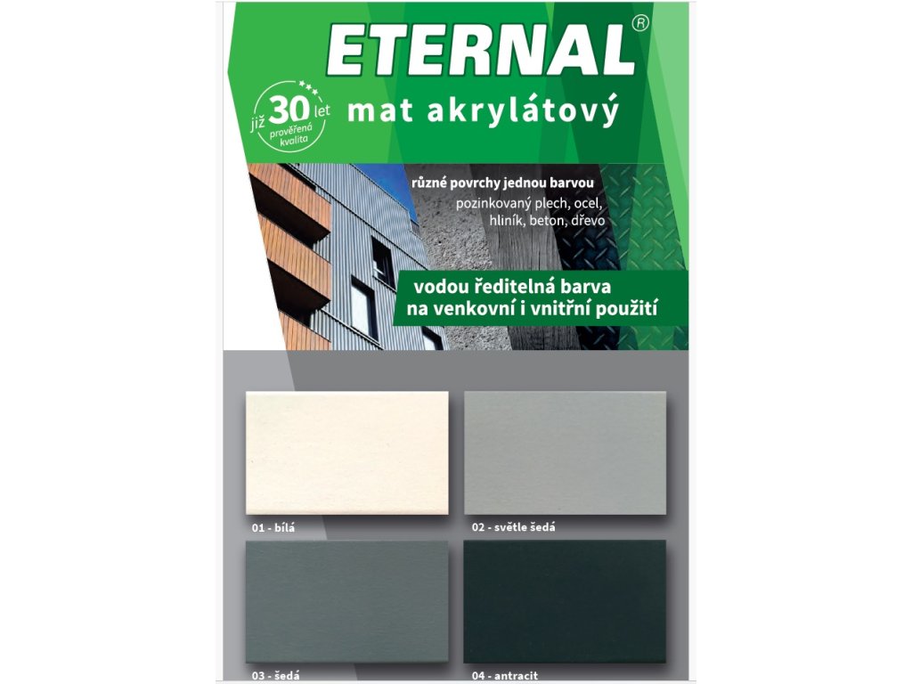 Kvalitní, vodou ředitelná akrylátová barva pro nátěry pozinkovaného plechu, oceli, hliníku betonu a dřeva. Mnoho variant jak velikostí, tak barevných odstínů.
