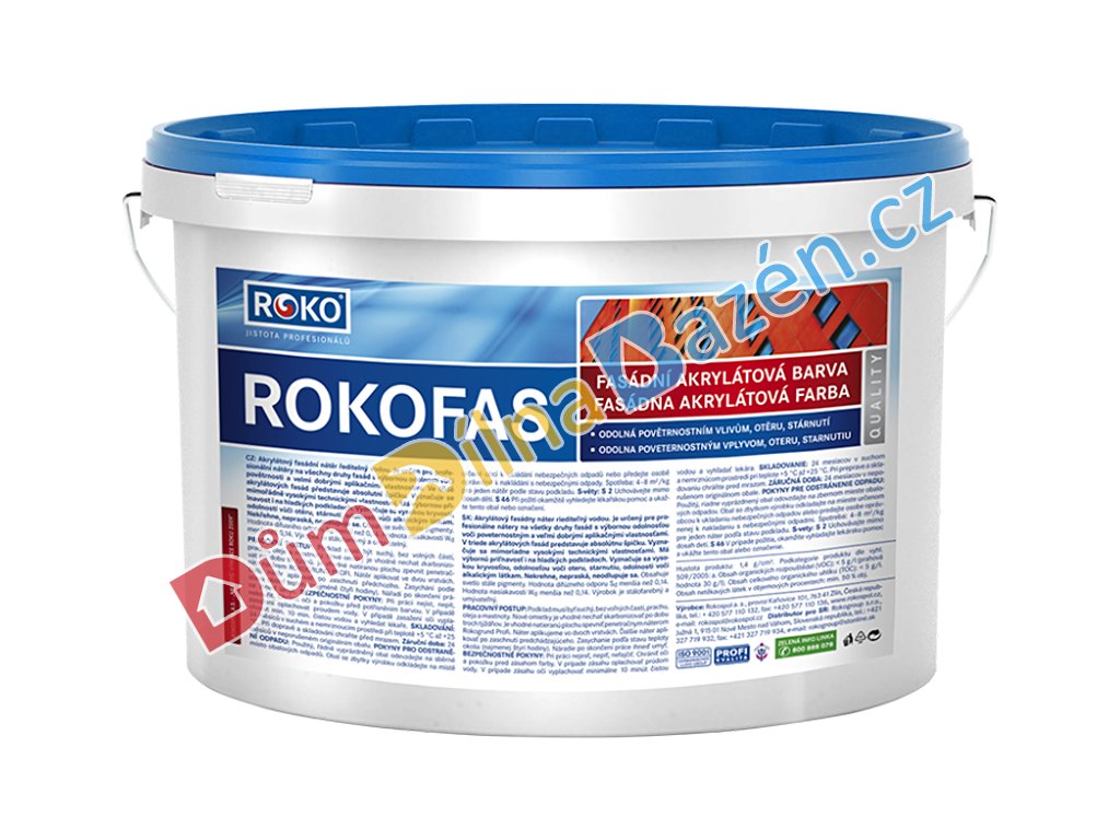 Rokofas je velmi odolná akrylátová fasádní barva a to zejména vůči otěru, klimatickým podmínkám či stárnutí, přičemž si zachovává svou paropropustnost. Více variant.